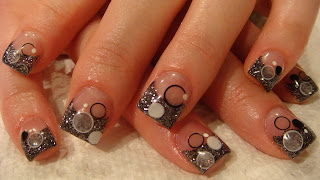 On these nails we went all out! This is acrylic in nebula at the tip then I faded a glitter from sparklesnailproducts.com called masquerade ball at the smile line. Then, I added silver dots and black and silver stars. Is there such a thing as too cute?! :)